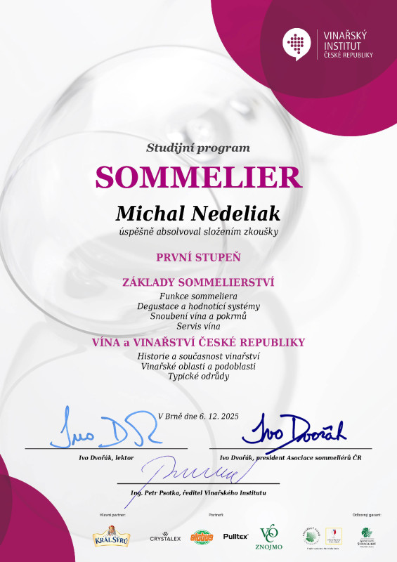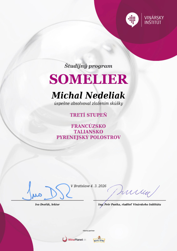 Za každým produktom v našom sortimente stojí certifikovaný someliér — absolvent Vinárskeho Inštitútu s dlhoročnou praxou v ochutnávkach a distribúcii prémiových vín pre slovenský trh. Ak by víno sám nekúpil, nenájdete ho tu.